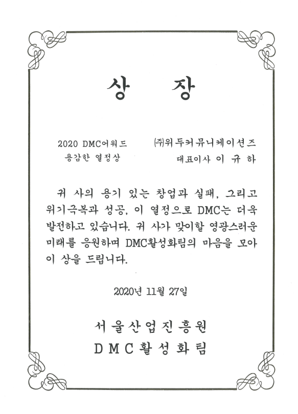 2020 서울산업진흥원 2020 DMC어워드 페이지 정보 작성자 WeDu 댓글 0건 조회 4,645회 작성일 21-12-31 12:57 본문 2020-11-27 2020 DMC어워드 용감한 열정상 서울산업진흥원 DMC활성화팀 List Previous2020 기술혁신 우수기업 21.12.31 Next2018 소년한국 우수 어린이 도서 19.05.30