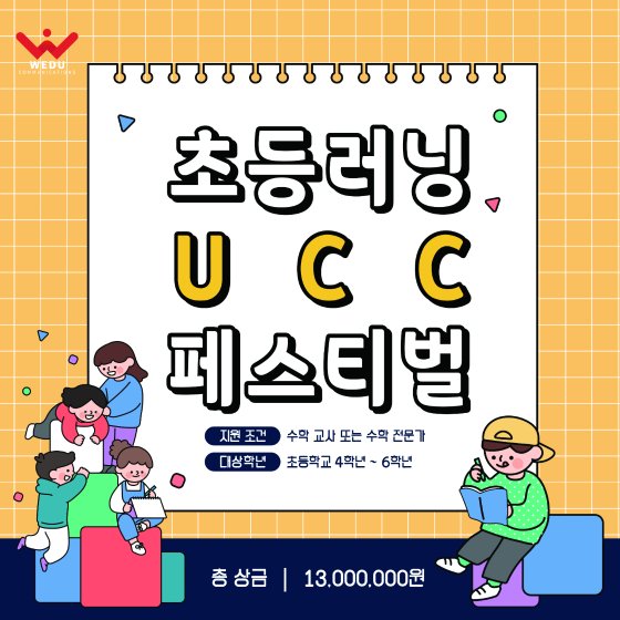 '초등러닝 UCC 페스티벌'은 초등 수학 콘텐츠 공모전이다. 위두커뮤니케이션즈(이하 위두)의 초등 수학 교육 플랫폼 'OLL KIDS/MATH'(오엘엘 키즈 매스)에서 열린다. 초등 수학 교사 또는 수학 전문가라면 누구나 참여 가능하다. 지원 기간은 오는 16일까지다.